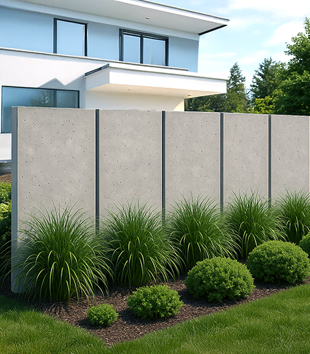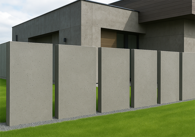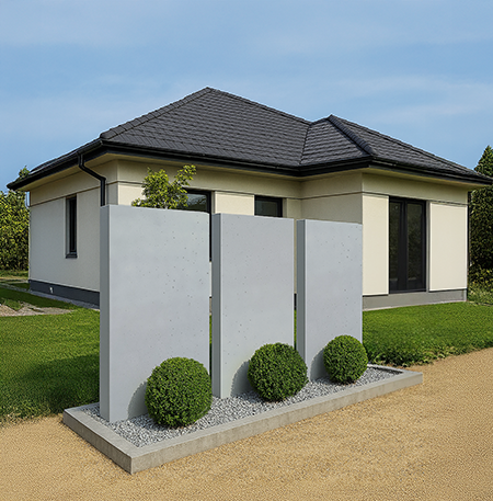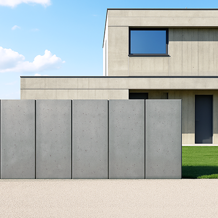 Ogrodzenie betonowe TYP L o nowoczesnym wyglądzie, zaprojektowane z myślą o współczesnej architekturze. Gładkie lico z subtelnymi porami technologicznymi podkreśla surowy, industrialny styl.